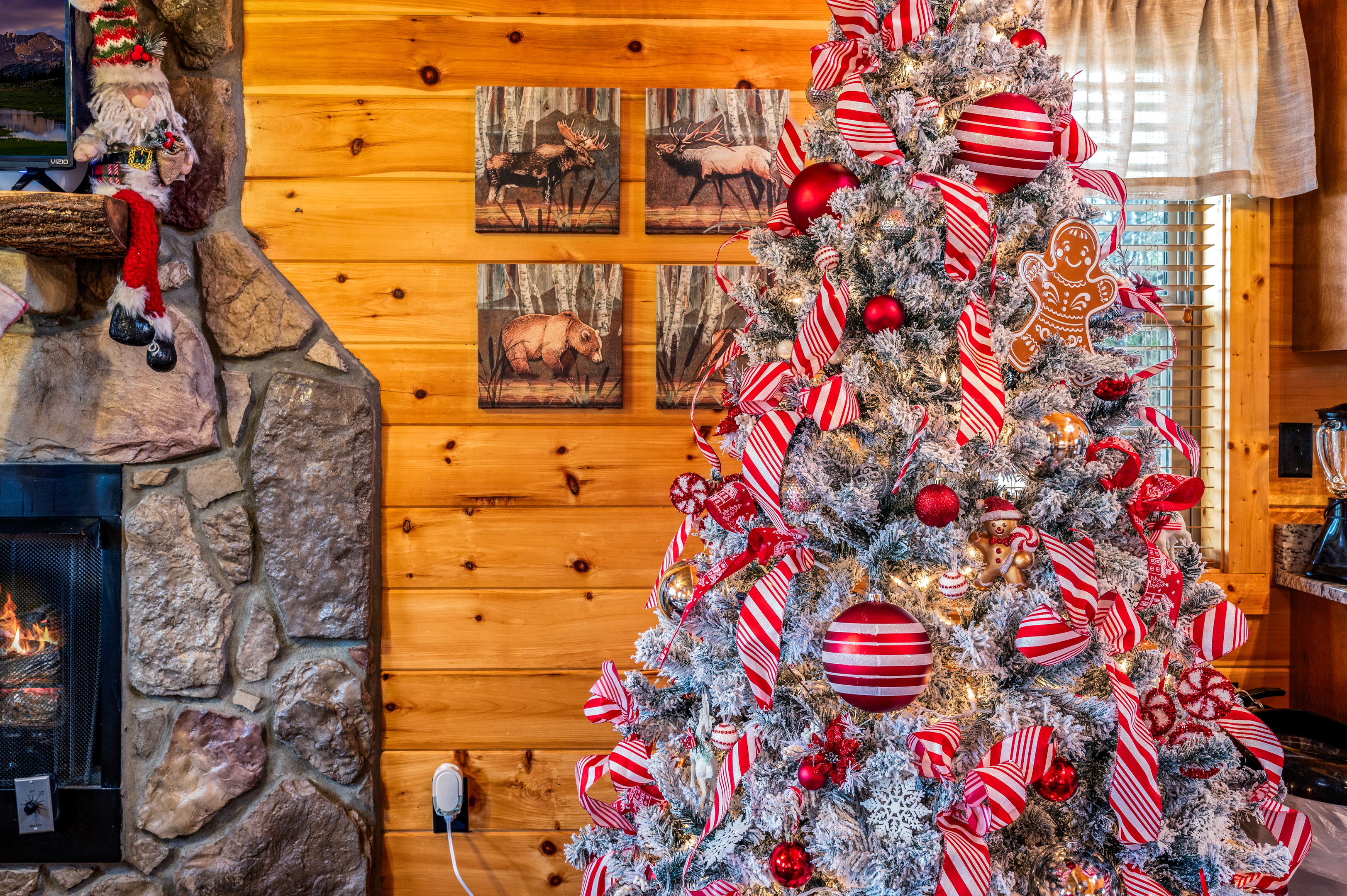 The main floor is an open-concept space with a spacious kitchen with stainless steel appliances, a large comfortable seating area with a smart TV, and a cozy fireplace. The sleeping area has a king-sized log bed and a heart-shaped jacuzzi tub. A full bathroom is also on this level with a large shower (for two, perhaps?).