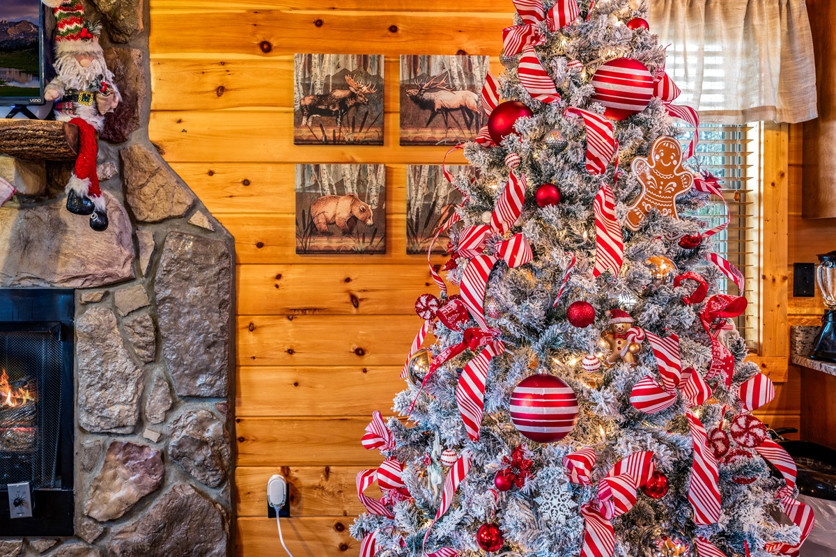 The cabin offers a unique treehouse experience with a rear deck and a hot tub. Inside, the whole family has plenty of room, with a cocktail arcade, smart TV, a private bathroom, and a heart-shaped tub.