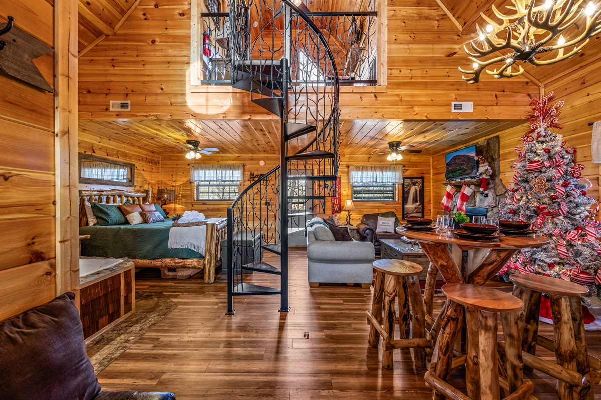A stunning custom staircase leads to the loft, where you'll find a queen-sized bed, a smart TV, and a cocktail arcade that will surely entertain kids of all ages.